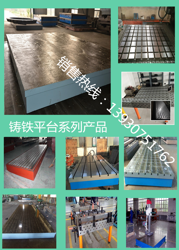 按JB/T7974-1999標準制造,產品制成筋板式和箱體式,工作面有長方形、正方形或圓形,材料HT200-300,QT400-600,ZG15-45。工作面采用刮研工藝,工作面上可加工V形、T形、U形槽、燕尾槽、圓孔、長孔等。平板是用于工件檢測或劃線的平面基準量具。電機試驗臺安裝就調至水平板、負荷均勻分布于各支點上。環境溫度(20±5)℃。使用時應避免振動。